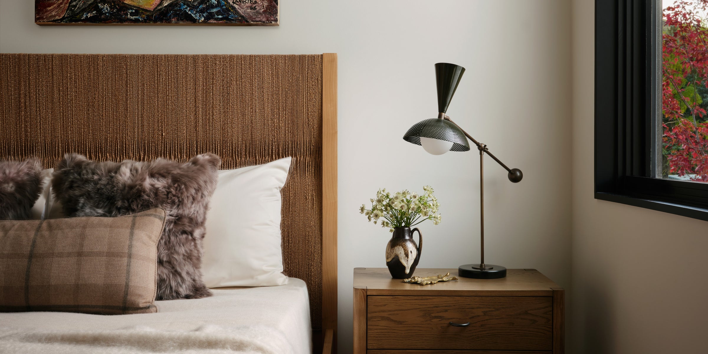 Our Monarch 3-Arm shines in this vibrant, pattern-forward guest bedroom designed by Andrew Suvalsky, featured in House Beautiful. The Natural Brass and Midnight finishes elevate the setting, bringing a playful yet sophisticated touch that harmonizes effortlessly with the bold color palette of the space.