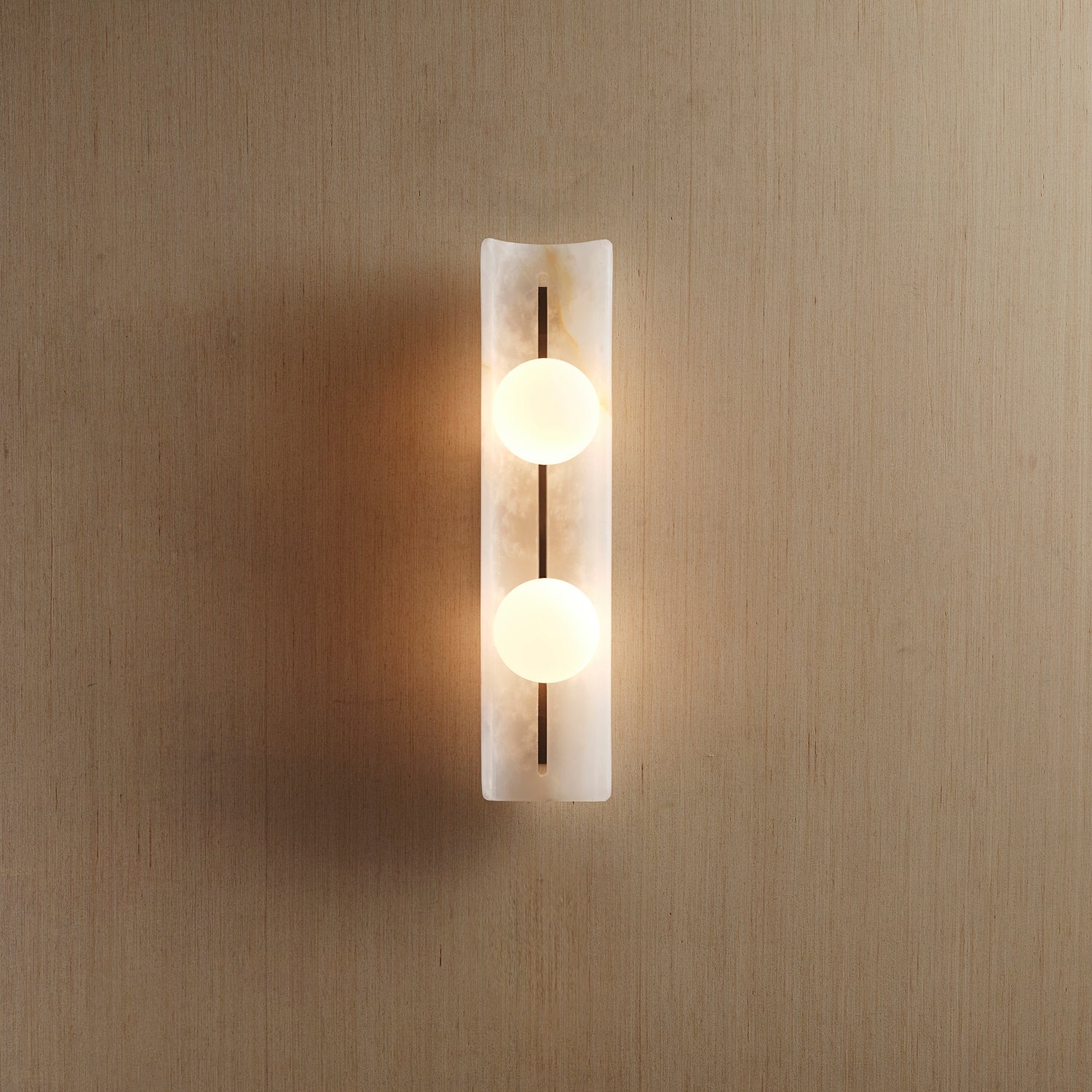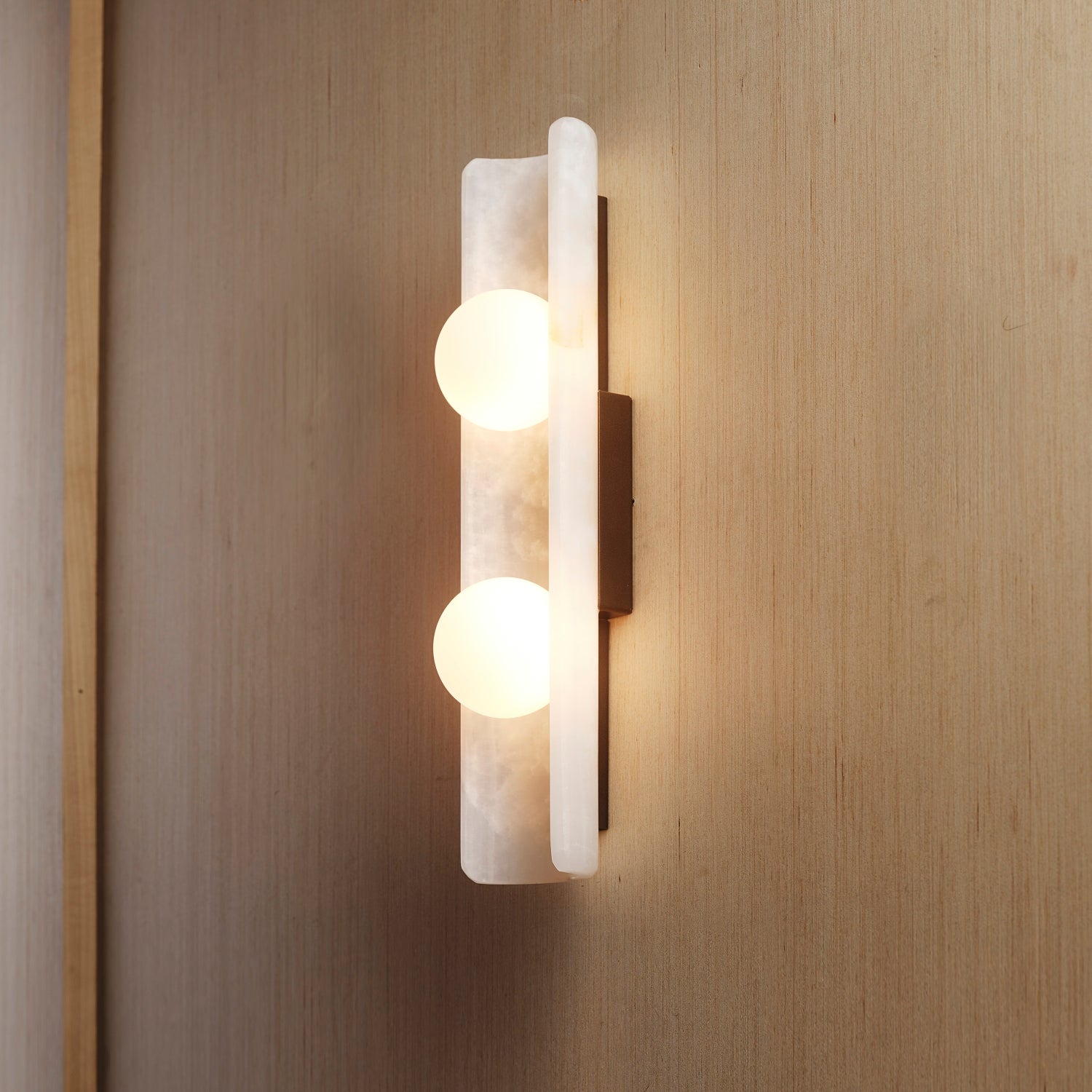 Channel 17 layers glowing glass within solid honed white onyx, revealing a play of depth and texture. Two illuminated globes accentuate the stone's organic beauty and sculptural simplicity. Thoughtfully designed to meet ADA compliance standards, this fixture supports accessibility in public and commercial environments without compromising on style.