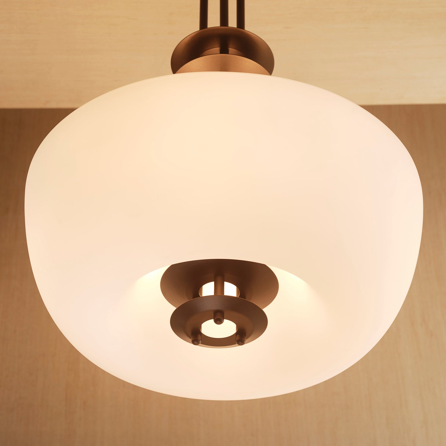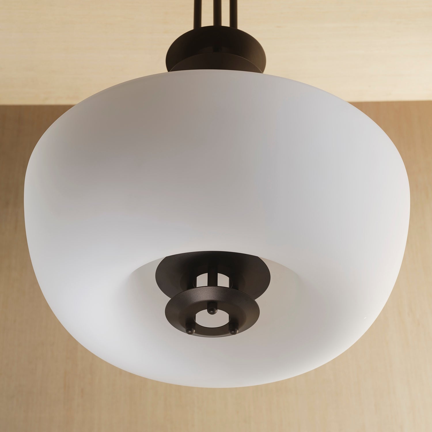 The Porto Semiflush balances proportion and presence with a space-age silhouette. Its matte white glass shade and decorative sculptural elements create a focal point that feels both modern and timeless.