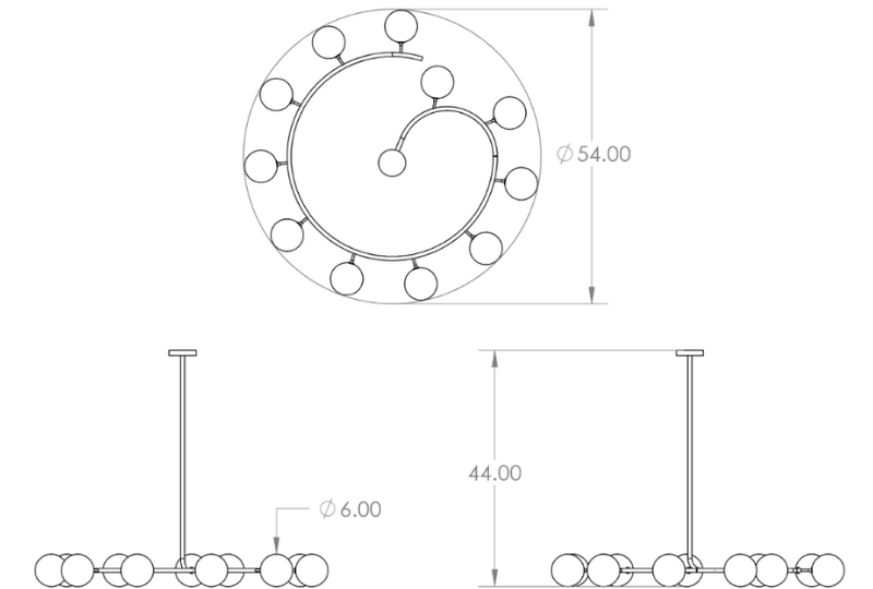 Glass globes are 6" in diameter and are threaded to screw easily around the socket. Fibonacci is also available in 34" and 44" diameters with 7 and 9 globes, respectively.
