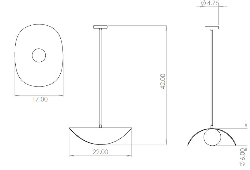 As shown: 17" W x 22" D x 42" H. Height of the body/shade is 6" diameter. Blown glass globe is 6" diameter and is threaded to screw easily around the socket. Shown at 42" tall, but drop height may be specified.