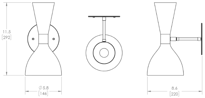 The Ludo Wall Sconce is a playful design scaled to work well in a breakfast nook, in a foyer, a forlorn corner, as a reading lamp, a bedside lamp or flanking a bathroom or powder room vanity. The perfect luxe addition to a master suite, nursery or glam room. Impactful in groupings or in pairs, but sculptural enough to stand alone. The spun aluminum cones are a vintage 1950s Italian design. Swiveling head allows for cone adjustment. This design is strongly influenced by both French and Italian Mid-Century Modernism.