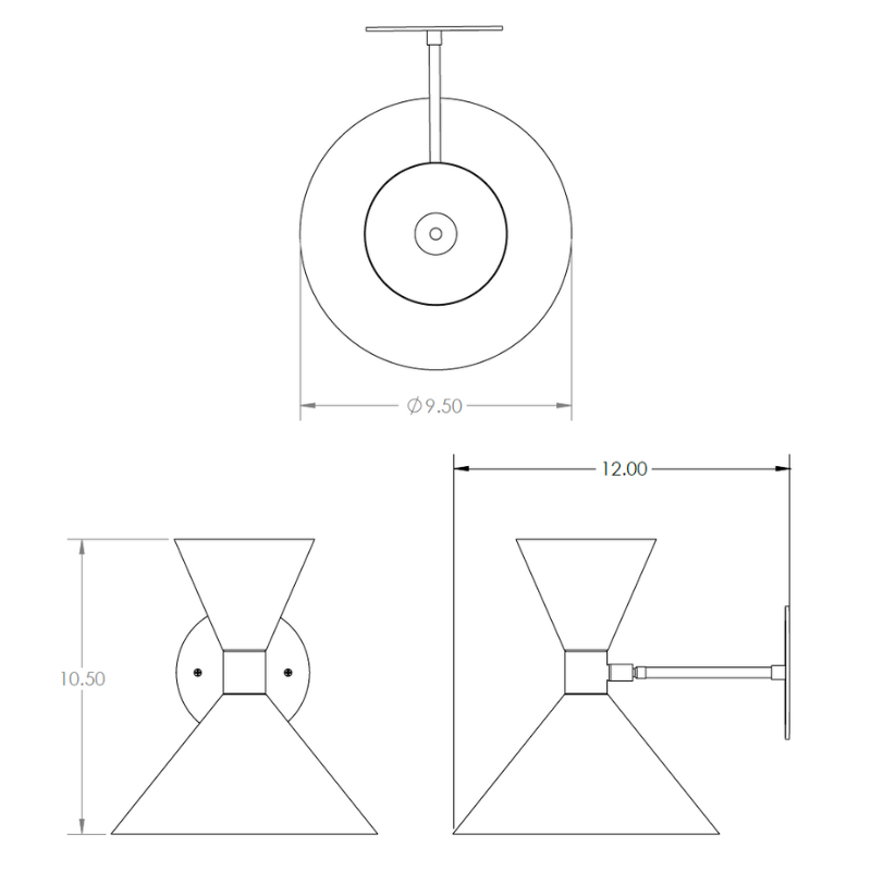 10.5" H x 12" D x 9.5" W . The upper cone has a 5" diameter while the lower cone has a 9" diameter. Arm length may be modified to fit your space at no additional cost.