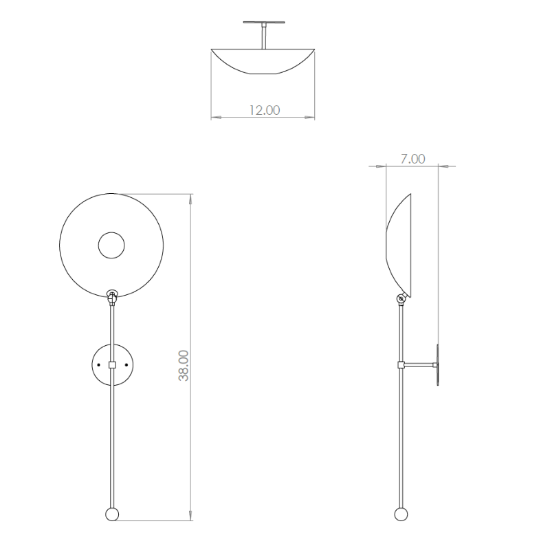 Standard dimensions as shown are: 12" W x 7" D x 38" H. Enameled spun aluminum disk is 12" diameter.